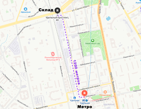 От станции метро Удельная пешком 1,2 км до склада Удельный пр. д.40.