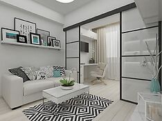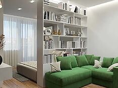 Дизайнеры не рекомендуют устанавливать в гостиной глухие перегородки, особенно если пространство и так страдает от нехватки естественного света. Отделить гостиную от спальни можно с помощью стеллажного ограждения, гибкой ширмы.