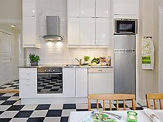 Такой вариант установки холодильника подойдет для небольшой семьи. Компактная модель полностью удовлетворит потребности 2-х человек. Это одноярусный холодильник, который идеально впишется в нижний ряд кухонного гарнитура.