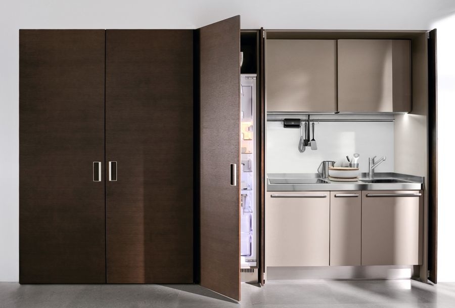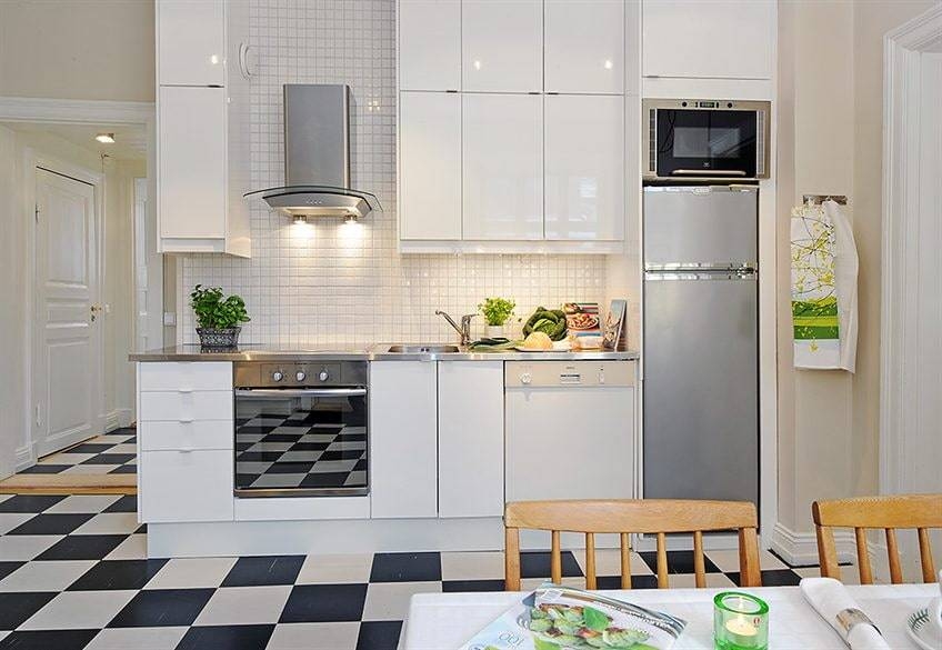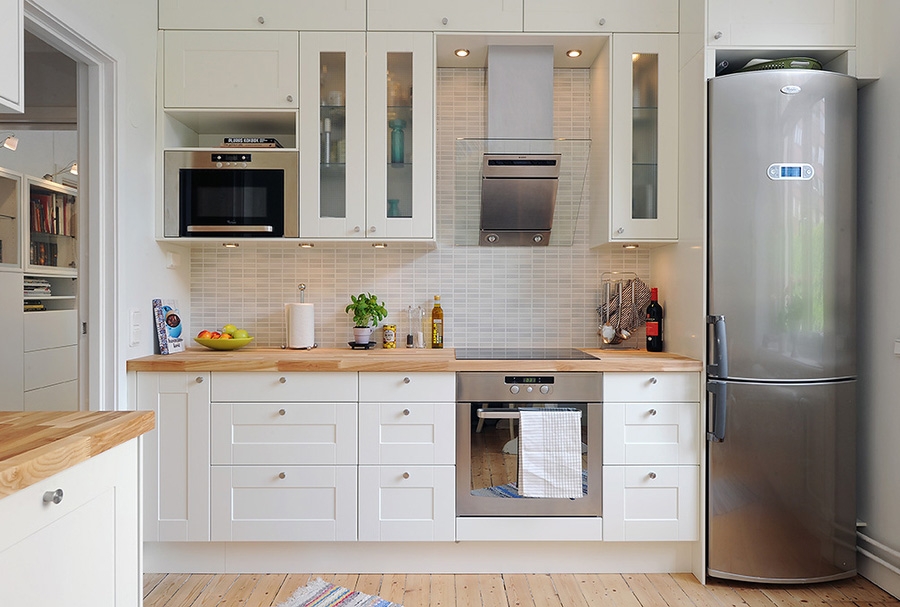 Если холодильник поставить возле двери, таким образом можно зонировать помещение. Также это очень удобно при заполнении продуктами после возвращения из магазина. Чтобы сделать более широкий проход, можно демонтировать двери. Такой подход позволит необычно оформить проем, визуально расширит пространство, облегчит обстановку.