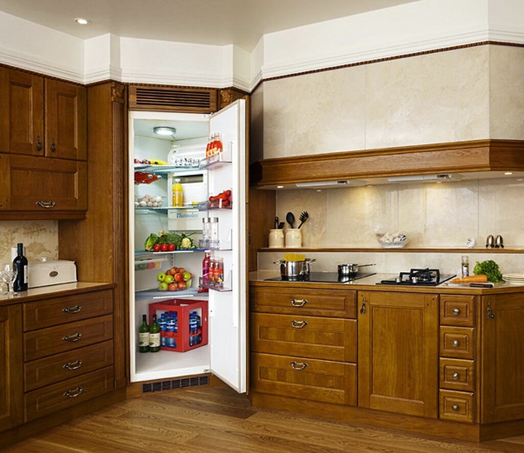 Техника находится за дополнительными стенками, происходит звукопоглощение. Это еще одно преимущество встроенного холодильника – ведь так приятно отдохнуть на кухне в тишине, не слыша гул работающего прибора.