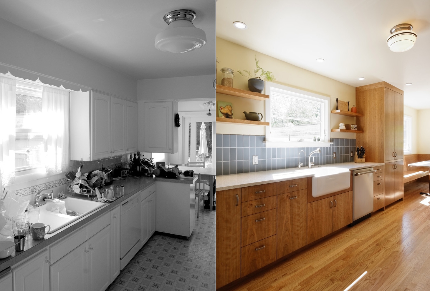 Если реставрация фасадов кажется вам чересчур сложным и хлопотным делом, можно их и вовсе снять. Это кардинальный способ обновления кухни, при котором нужно будет больше времени уделять порядку на полках.