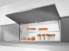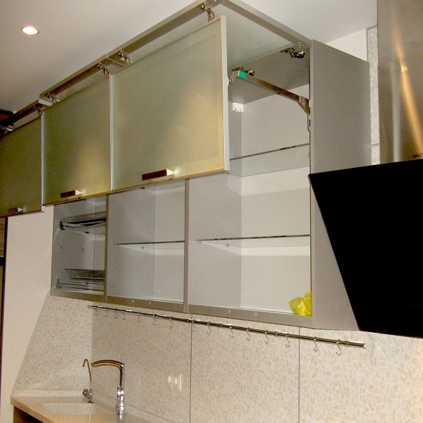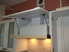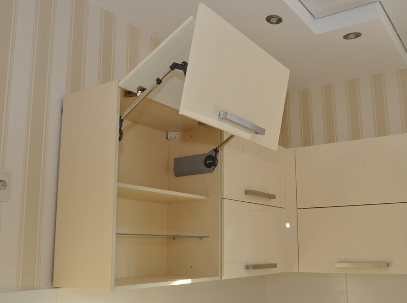 Альтернатива – дверки, поднимающиеся вверх. Да, они чуть дороже за счет наличия механизмов поддержки – микролифтов, но удобство того стоит. Газлифты фиксируют дверки в открытом положении, а также обеспечивают плавное закрытие без «хлопков». Обычно такое решение используется для горизонтально расположенных шкафчиков.