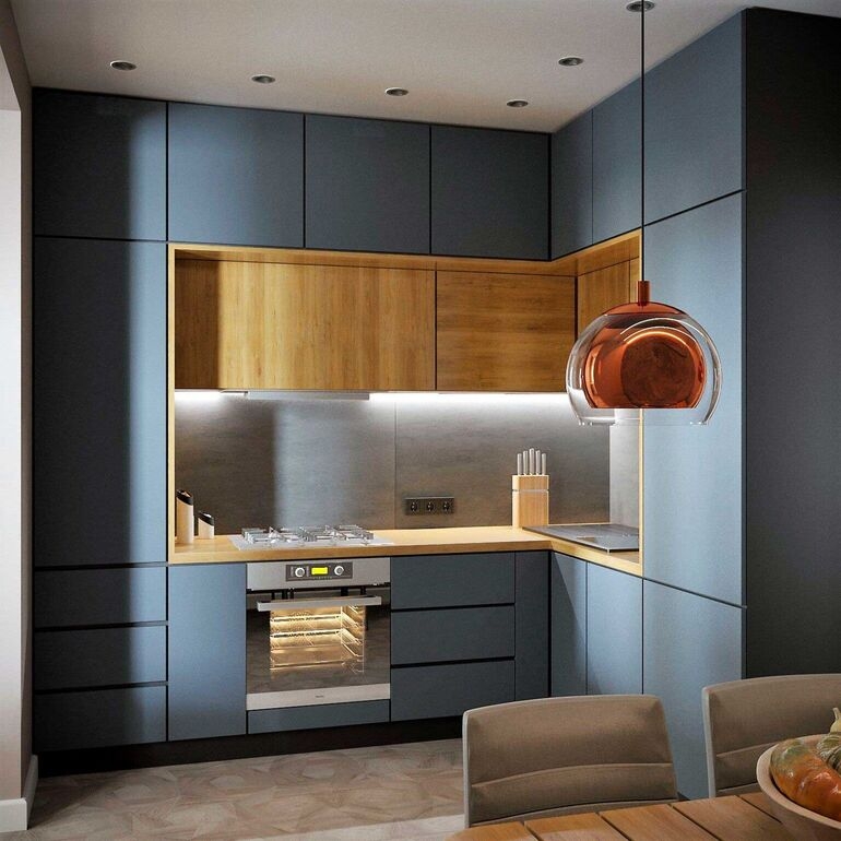 Вытяжка всегда является одним из акцентов кухонного интерьера. Но в компактной кухне очень жалко жертвовать для нее целый фрагмент свободной стены. Дизайнеры рекомендуют практичное решение – закажите шкафчик по индивидуальным размерам, который полностью или частично закроет вытяжной короб. Так вы сохраните монолитный дизайн гарнитура и одновременно получите полезный объем для организации системы хранения.