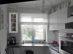 На кухнях с высокими потолками можно установить подъемные дверцы. Это современное, технологичное, необычное и красивое решение. Кухня с такой системой открывания створок всегда смотрится оригинально. Система удобна и безопасна, идеально подходит для тесного пространства.