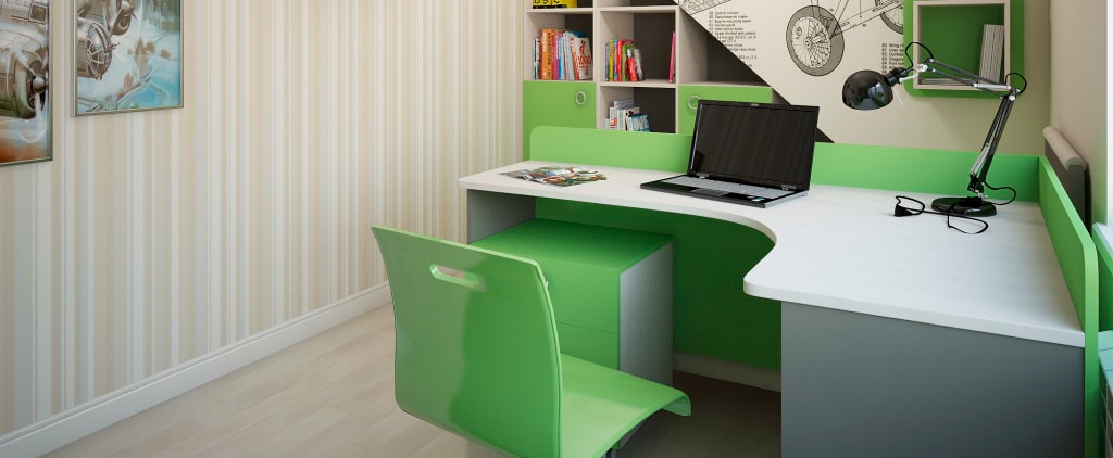 Одно из удачных компоновочных решений — комбинированные уголки. Рабочий стол, шкаф и кровать выполняются в одном стиле. Ваш ребёнок оценит кресло с регулируемой спинкой, способствующей сохранению правильной осанки. В детскую комнату гармонично впишется компактная двухуровневая кровать. Расположение спальных мест сверху и снизу существенно сэкономит пространство. Для того чтобы ребёнок мог прилечь между выполнением домашних заданий подойдёт небольшой диванчик или кресло – кровать.