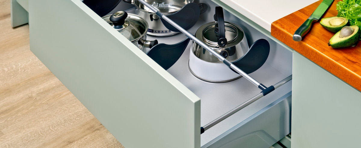 Это одна из инновационных разработок, помогающая сделать кухню практичнее, комфортнее. Специальные рельсы устанавливаются на боковые стенки ящиков, из-за чего элементы конструкции выдвигаются легко, плавно, быстро, бесшумно.