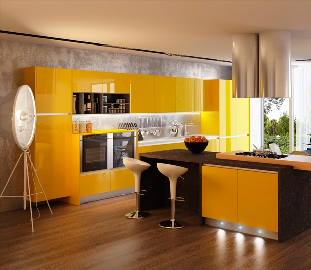 Плиты МДФ покрываются краской, ламинируются декоративной плёнкой или оклеиваются шпоном, имеющим структуру дерева. Поверхность МДФ может быть матовой или глянцевой. Для визуального увеличения полезного пространства кухни используют глянцевые фасады, хорошо отражающие свет. С другой стороны, на матированной поверхности менее заметны отпечатки пальцев, следы жира и мелкие царапины.