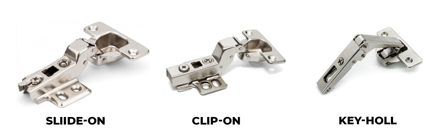 2. Clip-on. Верхняя часть петли с быстросъёмным креплением устанавливается в пазы ответной планки, зафиксированной на фасаде;