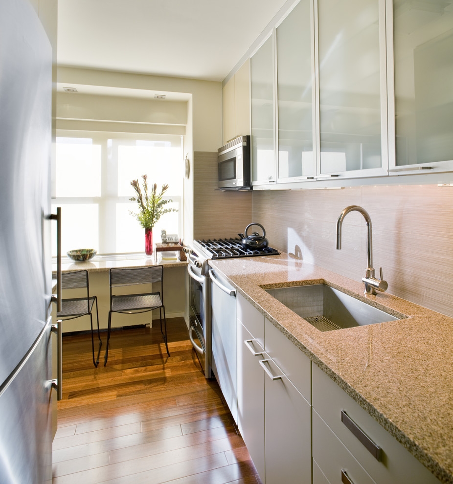 Для узких кухонь лучше всего приобретать и узкие гарнитуры. Необходимо сделать проход максимально свободным. Лучше всего заказывать такие кухни по индивидуальным размерам с учётом геометрических особенностей помещения. Стандартные кухни с навесными шкафами лишь съедят и без того небольшое пространство.
