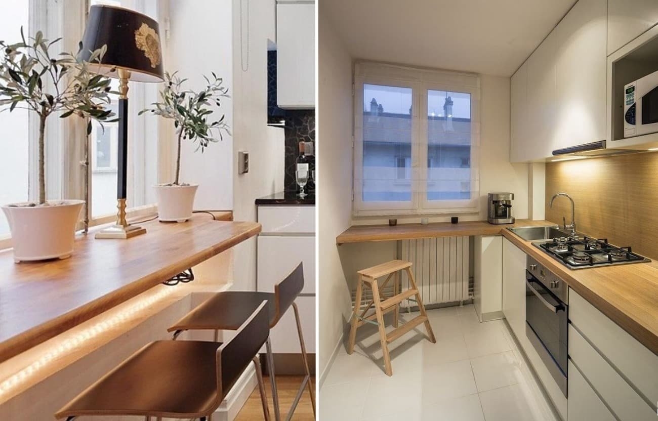 Подоконник можно использовать и в качестве рабочего пространства, и как обеденную зону. Демонтируйте стандартный пластиковый подоконник и установите широкий. Цвет можно сделать таким же, как и у столешницы гарнитура. Тогда он будем смотреться естественным продолжением.
