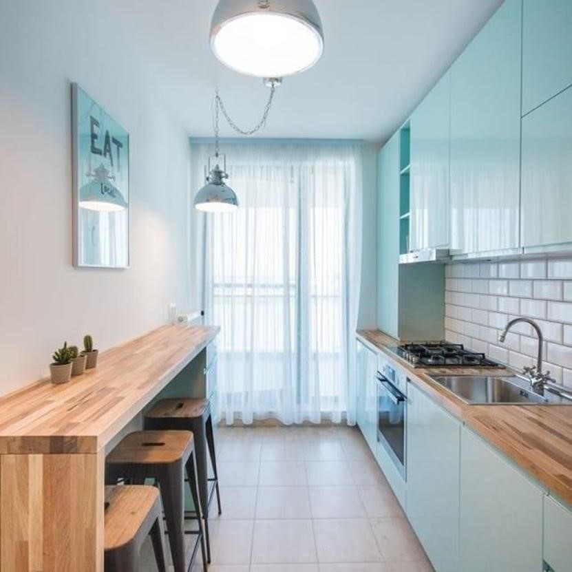 Если подоконник в качестве барной стойки не подходит по каким-либо причинам, то приобретите её отдельно и разместите вдоль стены. Она компактна, но при этом является идеальным местом для завтрака. Барная стойки особенно эффективный вариант, если в квартире проживает не более 2х человек.