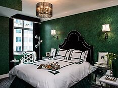 «Арт-деко», казалось бы, не предполагает использование зелёных оттенков при оформлении спальни. Но это является ошибочным мнением. Именно на интенсивном зелёном фоне располагается «визитка» стиля – Sunburst, зеркало с диагонально расходящимися солнечными лучами. Это символ жизни, тепла, развития и позитива.