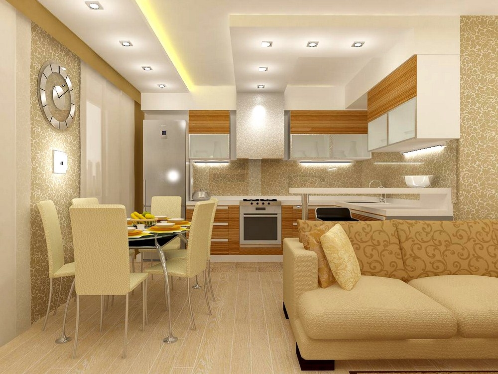 Часто кухни такой большой площади совмещают с гостиными, убирая перегородки и стены. При таком способе можно создать несколько обособленных автономных «зон». Считается, что для рабочей площади будет достаточно места 5 м2, а всё остальное пространство будут занимать зоны отдыха, приёма пищи, барная стойка и т.д. Применяя идею зонирования пространства, стоит помнить о том, что каждый модуль не должен выпадать из общей концепции дизайна и отличаться по стилю. Грамотно спланированное зонирование кухни – залог изысканного и оригинального дизайна квартиры.
