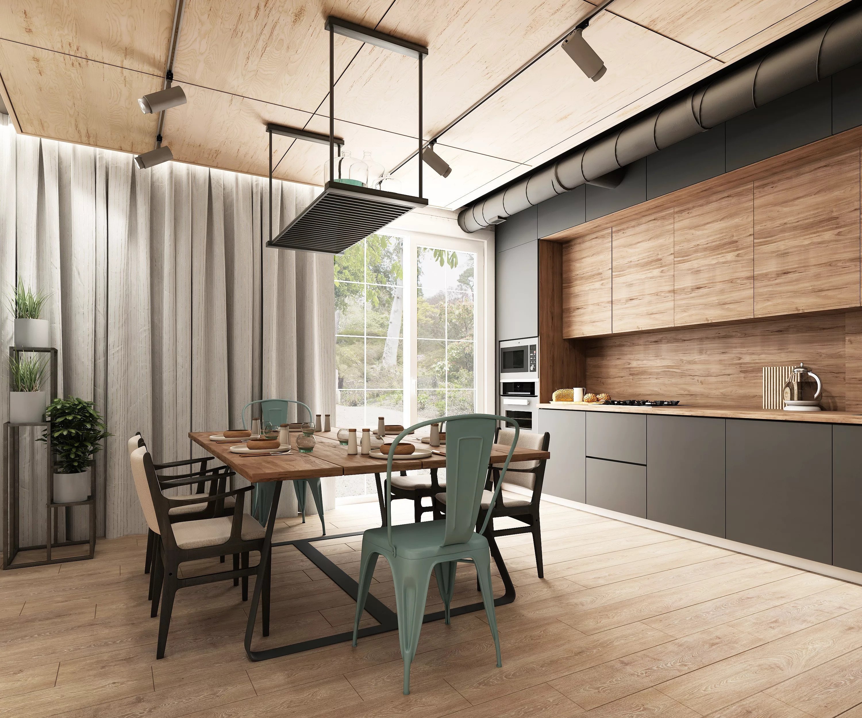 Если кухня имеет высокий потолок, его можно украсить лёгкими деревянными балками, внутри которых будут уложены коммуникации. Этот элемент присущ стилю лофт, но, как говорилось выше, эко базируется на современных направлениях и от каждого берёт определённые штрихи.