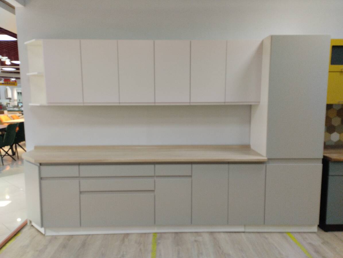 Палитра линейки позволяет с легкостью сочетать между собой все оттенки, получая новые неожиданные хиты. Ошибиться и не создать превосходное сочетание просто невозможно. Это позволяет облегчить работу с подбором кухонного гарнитура. Гладкие фасады без ручек подчёркивают актуальный монолитный вид гарнитура и особенно эффектно смотрятся на высоких, до самого потолка, секциях.